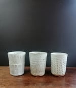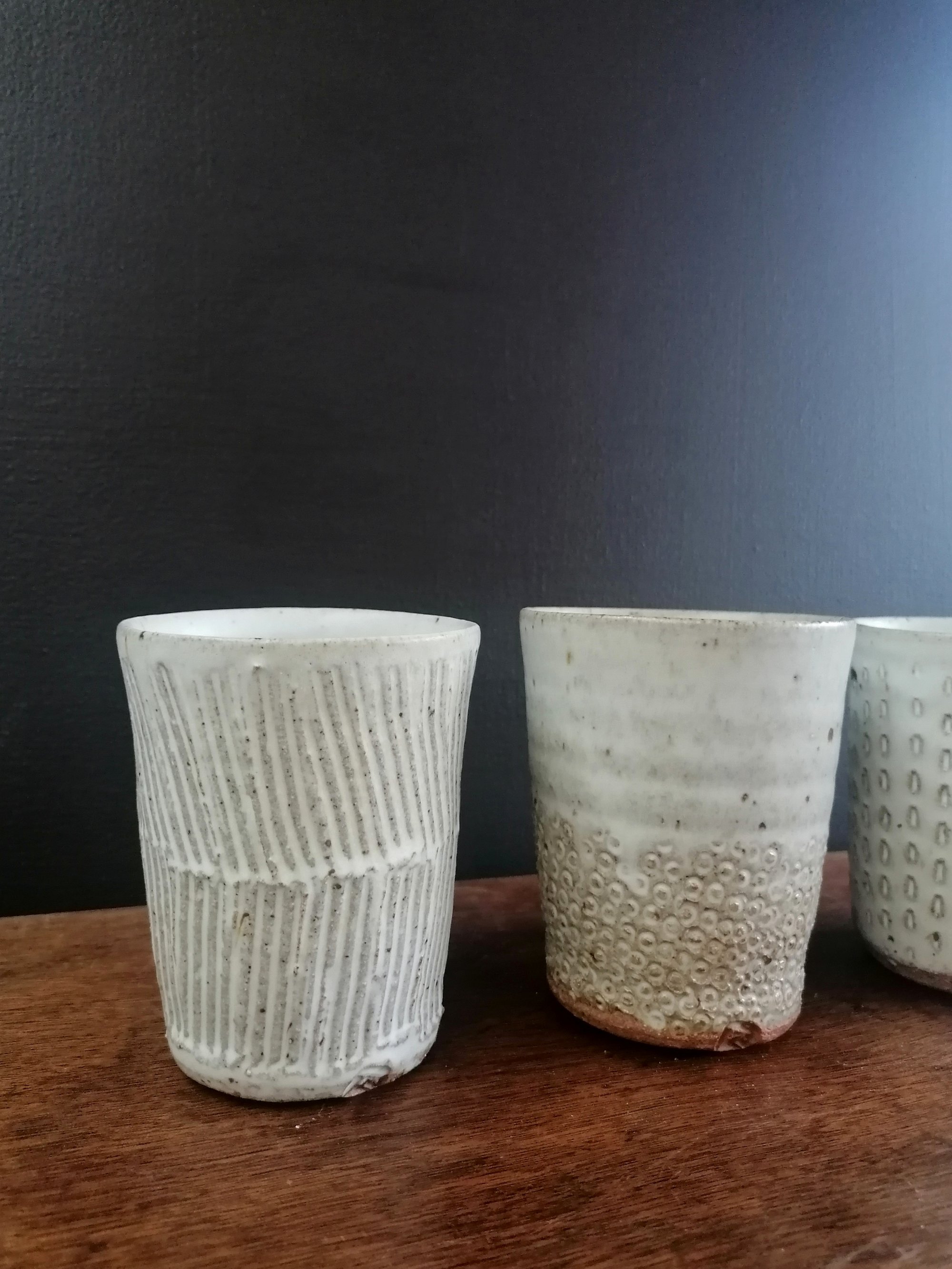 A trio of beakers all thrown from an iron rich clay, textured in three different ways.