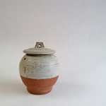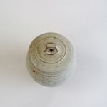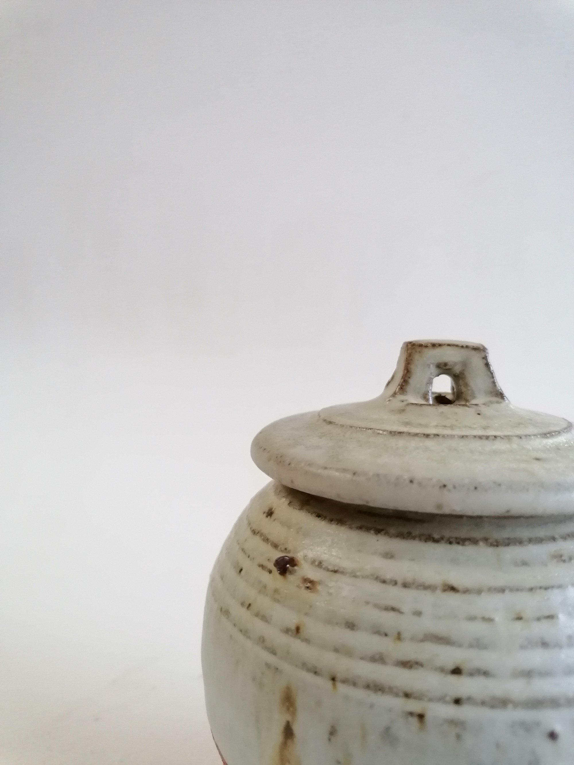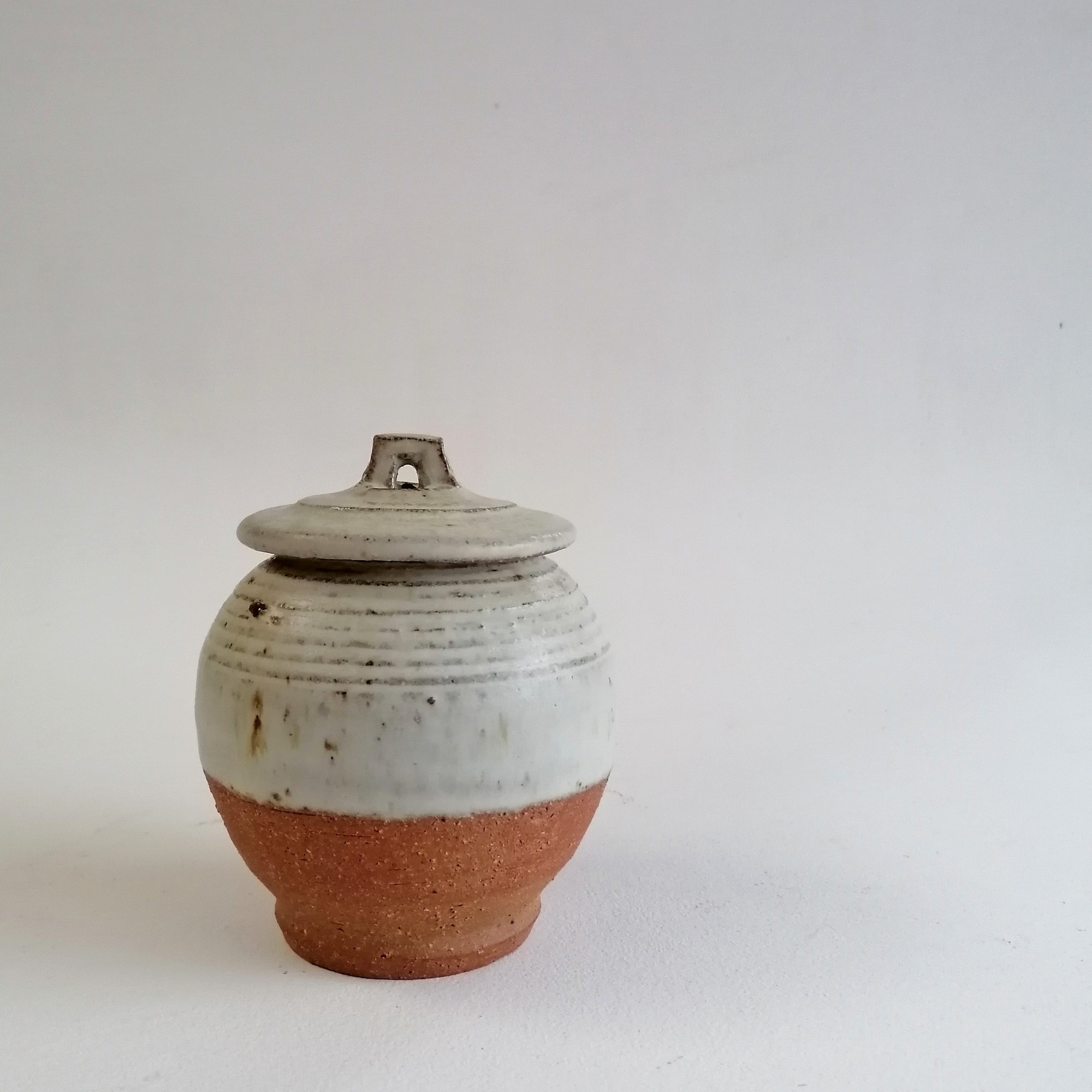Thrown from a very iron rich clay blend which has local clay inclusion added, some of which are emerging from under the glaze layer. Horizontally ribbed texture and glazed with my Cornish Stone and Dolomite glaze. Approx 13cm tall
