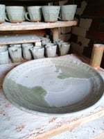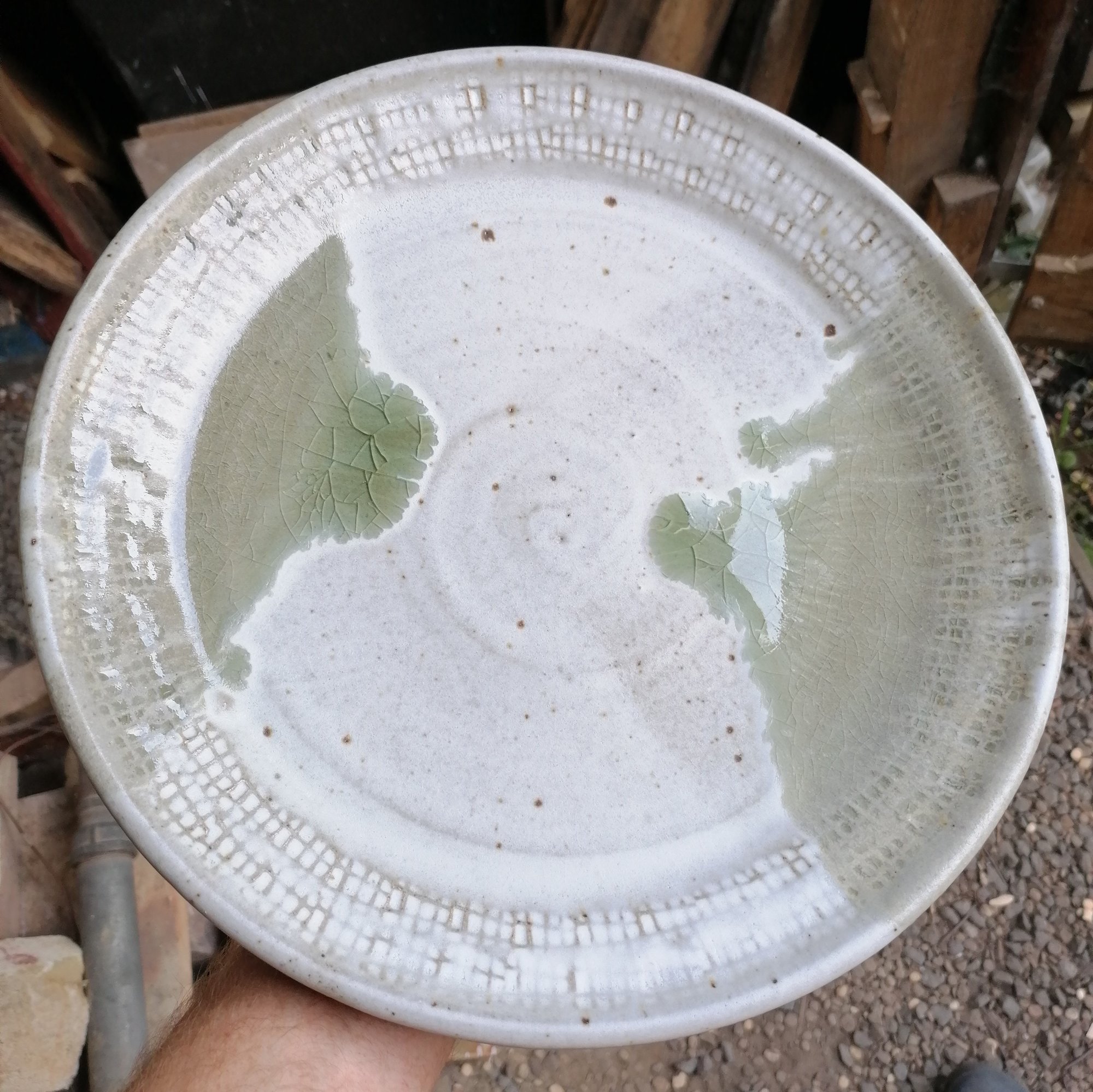 A thrown and stamped plate glazed with my Dolomite and Cornish stone glaze and glassy green Ash glaze pours.