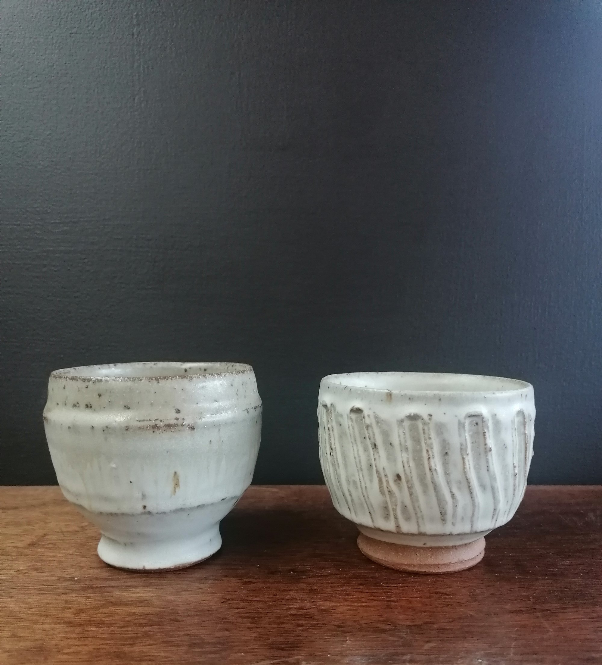 Left: thrown from the same iron rich clay blend and glazed with both Cornish stone and Dolomite glaze and a mixed wood ash glaze. Approx 9cm tall x 9cm wide at the rim.