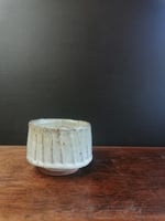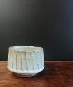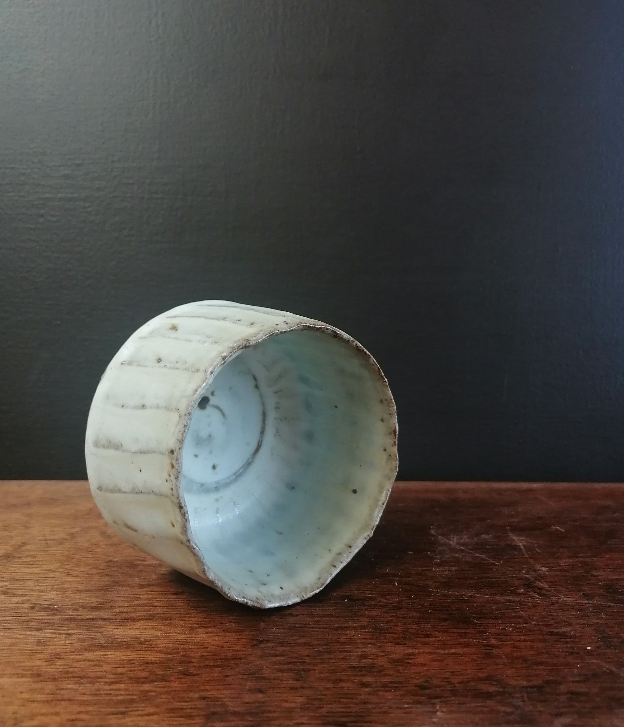 Thrown and softly fluted while still on the wheel. Made from a new high iron clay blend and glazed with my Cornish Stone and Dolomite glaze with additional melted hardwood ash. Approx 7.5cm tall x approx 9cm diameter at the rim.